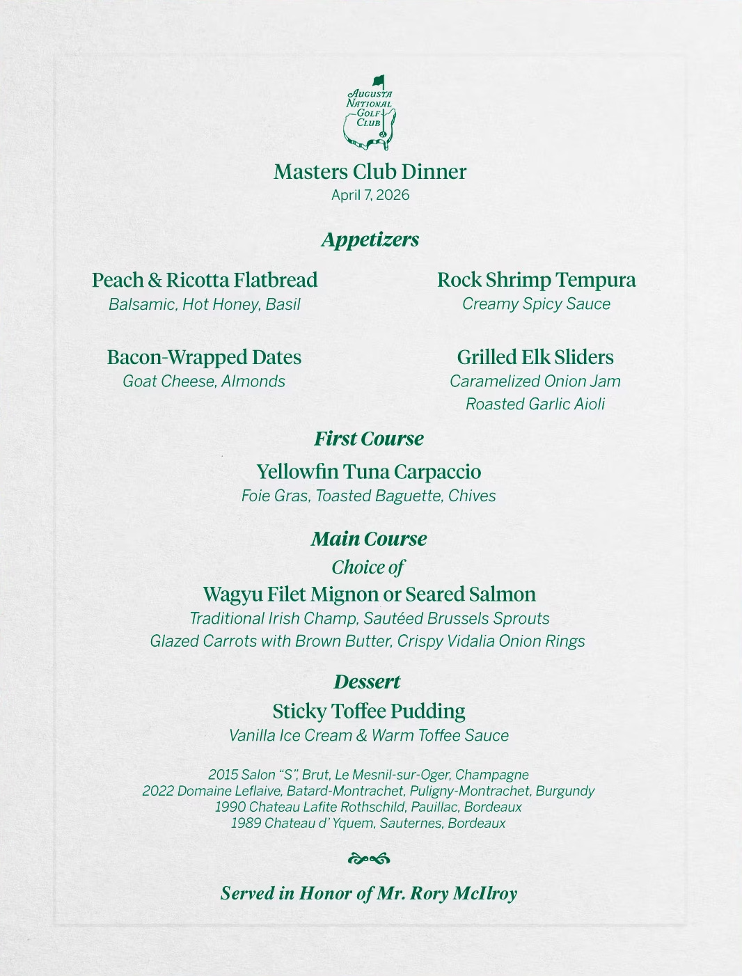 Wednesday, McIlroy made his culinary wishes known for the 2026 Masters Club dinner.